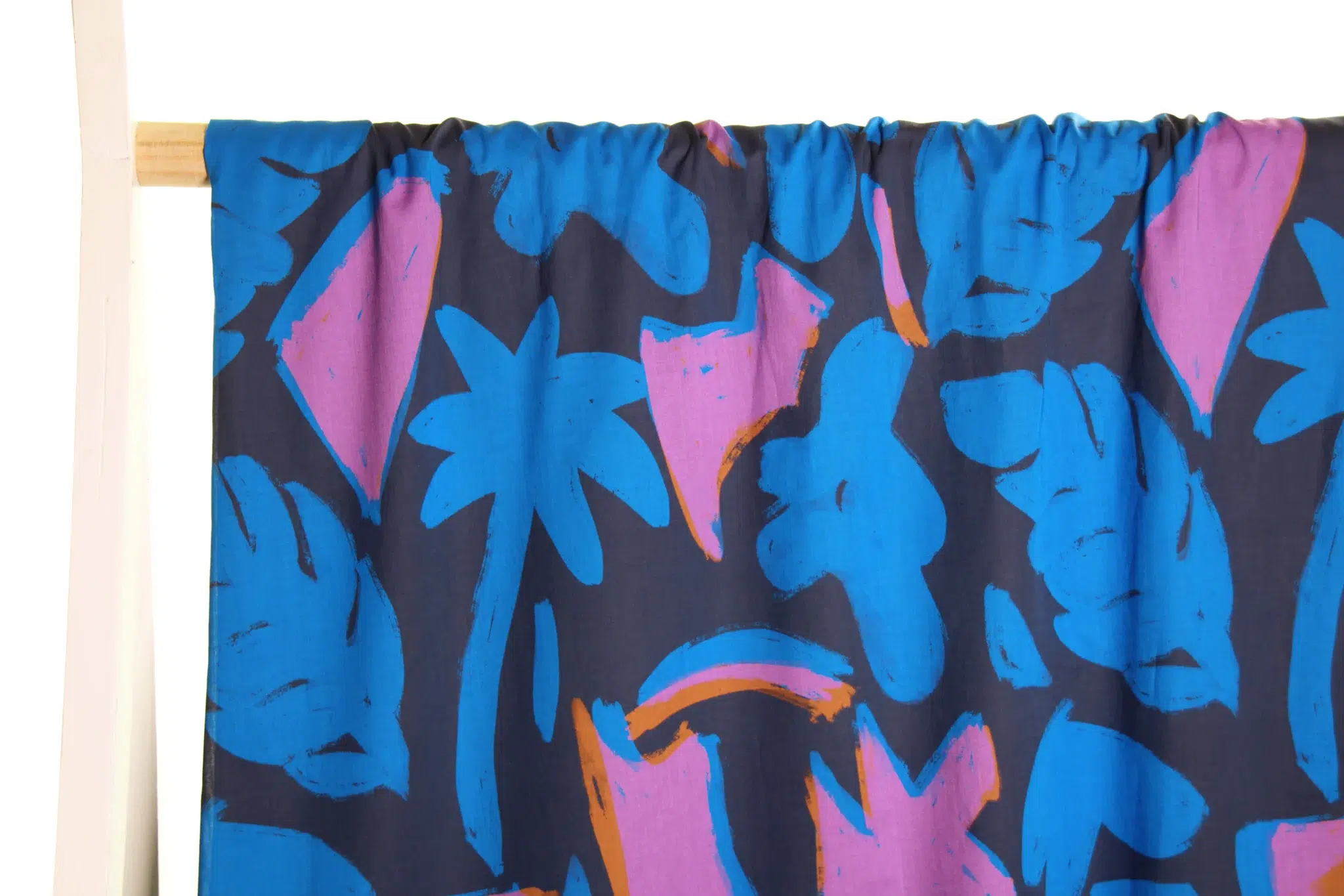Eine feine, dunkelblaue Baumwolle mit abstrakten Blättern und Palmen in leuchtendem Blau und Flieder. Dieser Stoff ist perfekt für Blusen, Kleider, Röcke…