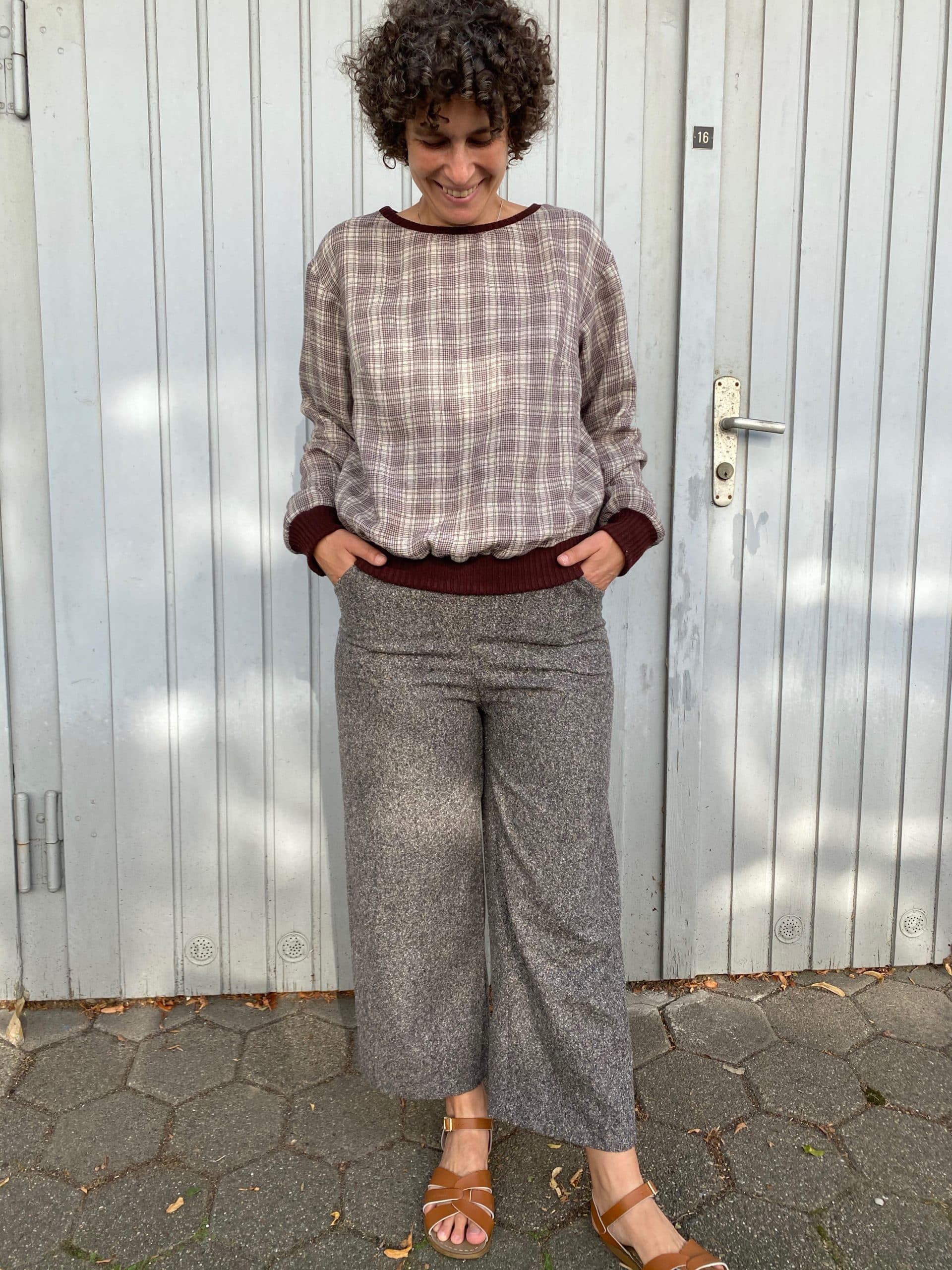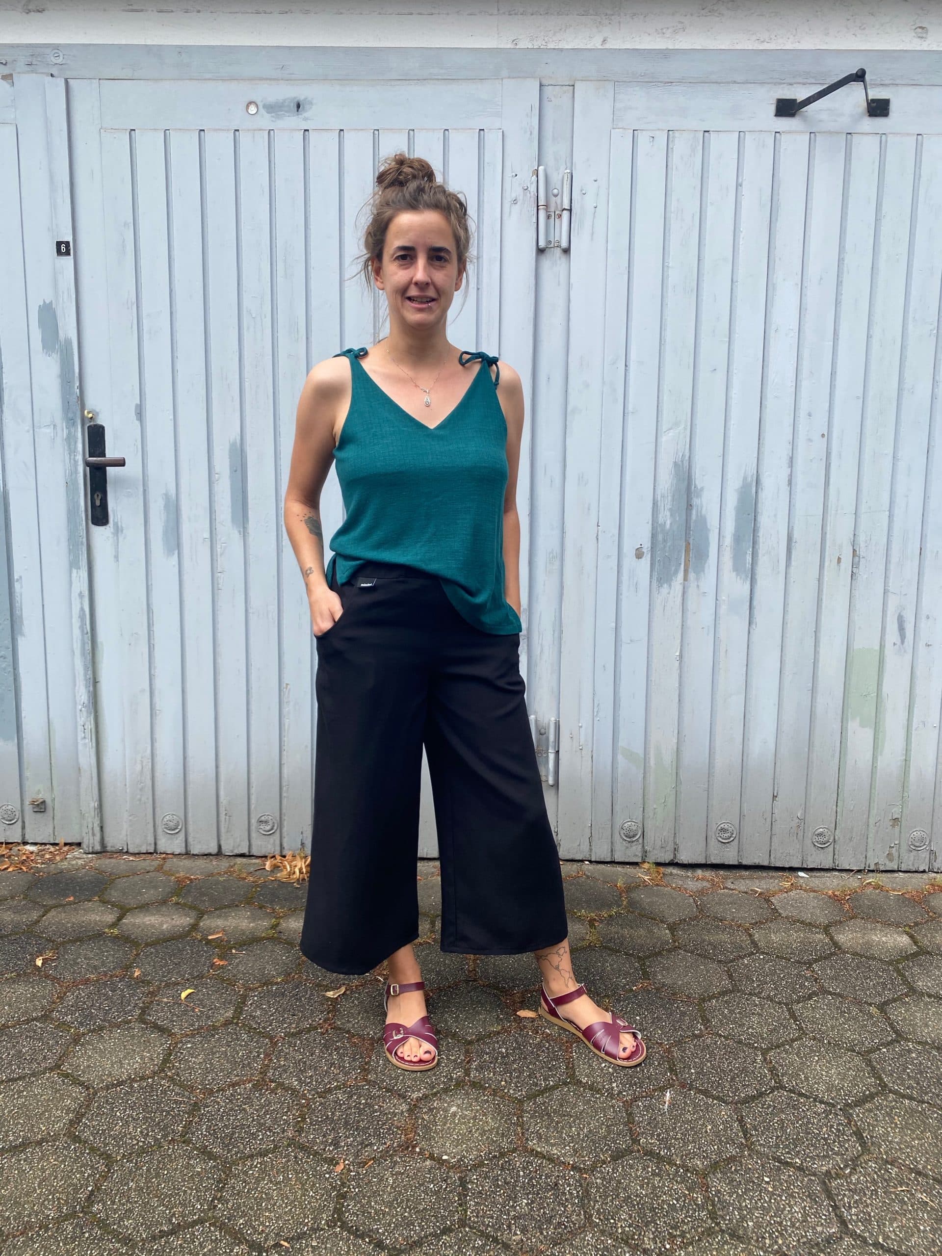 Wir haben die Hose mittlerweile etwas überarbeitet und zusätzlich die Variante einer Culotte eingearbeitet. Ihr könnt die Hose jetzt also auch mit Gummi, statt Bündchen und in trendiger 3/4 Länge nähen 🙂