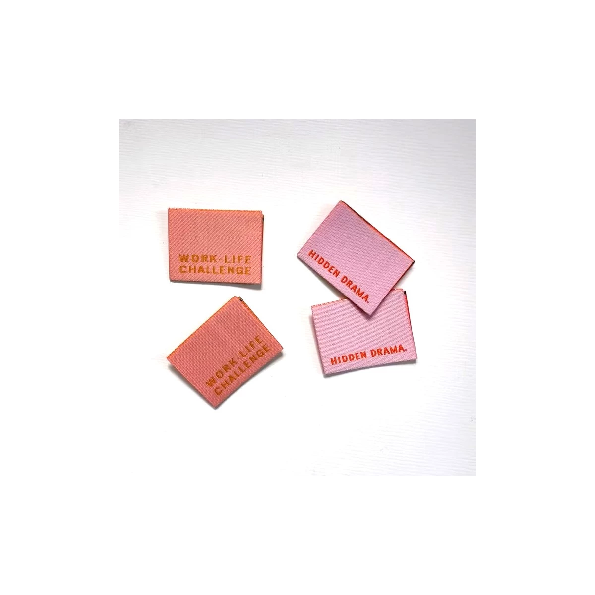 Du bekommst 4 Etiketten in einem transparenten Umschlag, je 2 Etiketten mit „work-life challenge“ und „hidden drama“.