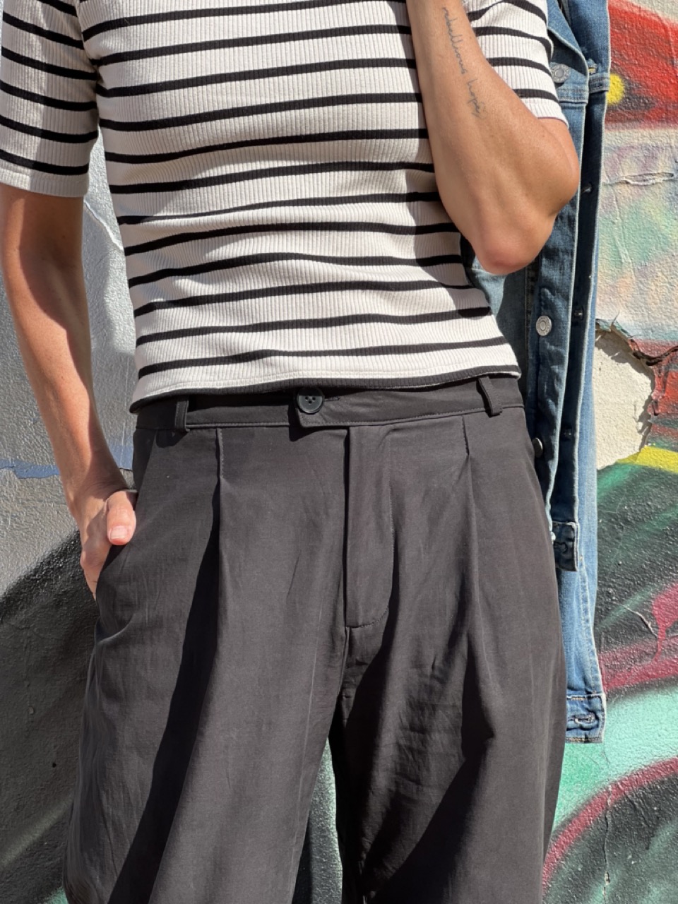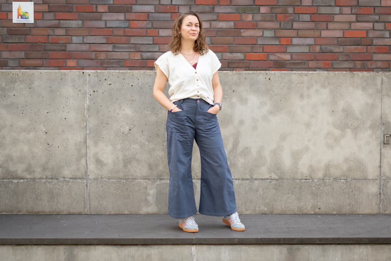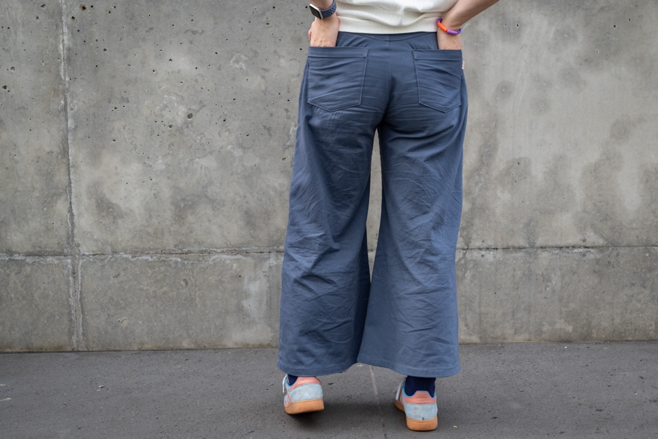 Hose Guste ist eine variantenreiche Hose. Sie kann als Culotte oder mit langem ausgestelltem Bein genäht werden. Sie hat hinten eine Passe, die eine tolle Passform garantiert. Außerdem kannst du wählen, ob du sie Vorn mit coolen Falten oder einfach glatt nähen magst. Sie bringt außerdem zwei Möglichkeiten der Taschenverarbeitung mit sich. (Die Variante mit den Falten kann nur mit den Eingriffstaschen genäht werden!)